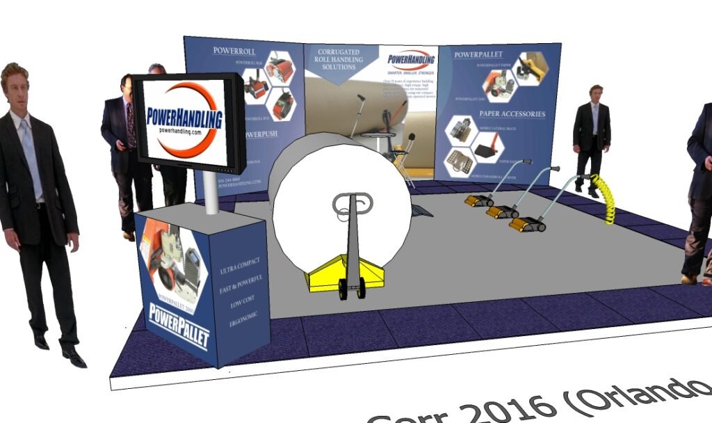 Design and develop an exhibition stand for the CorrExpo Exhibit in Orlando, USA. The stand must contain references to all industrial rollers, showcasing their advantages. A large floor space for demonstrations is required, as is a monitor with promotional video. Mock-ups to be provided in 3D. Technical Copywriting material to be undertaken from engineer manuals.
