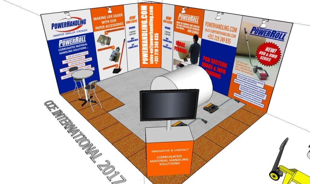 Design and develop an exhibition stand for the CCE International Trade Show in Munich, Germany. The stand must contain references to all industrial rollers, showcasing their advantages. A large floor space for demonstrations is required, as is a monitor with promotional video. Mock-ups to be provided in 3D. Technical Copywriting material to be undertaken from engineer manuals.
